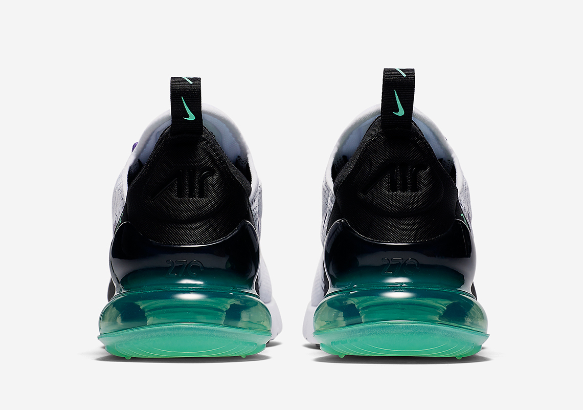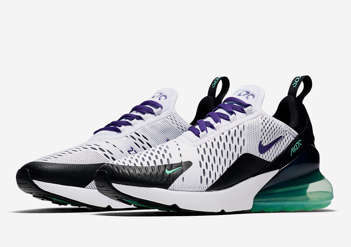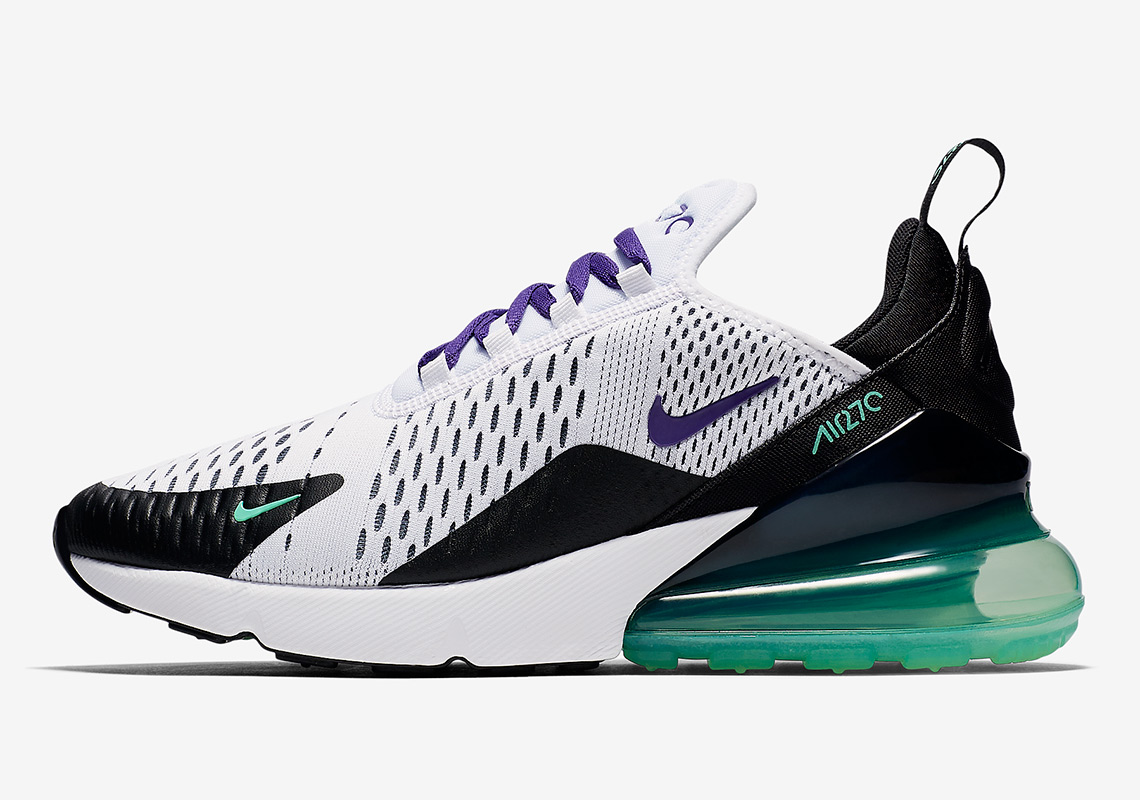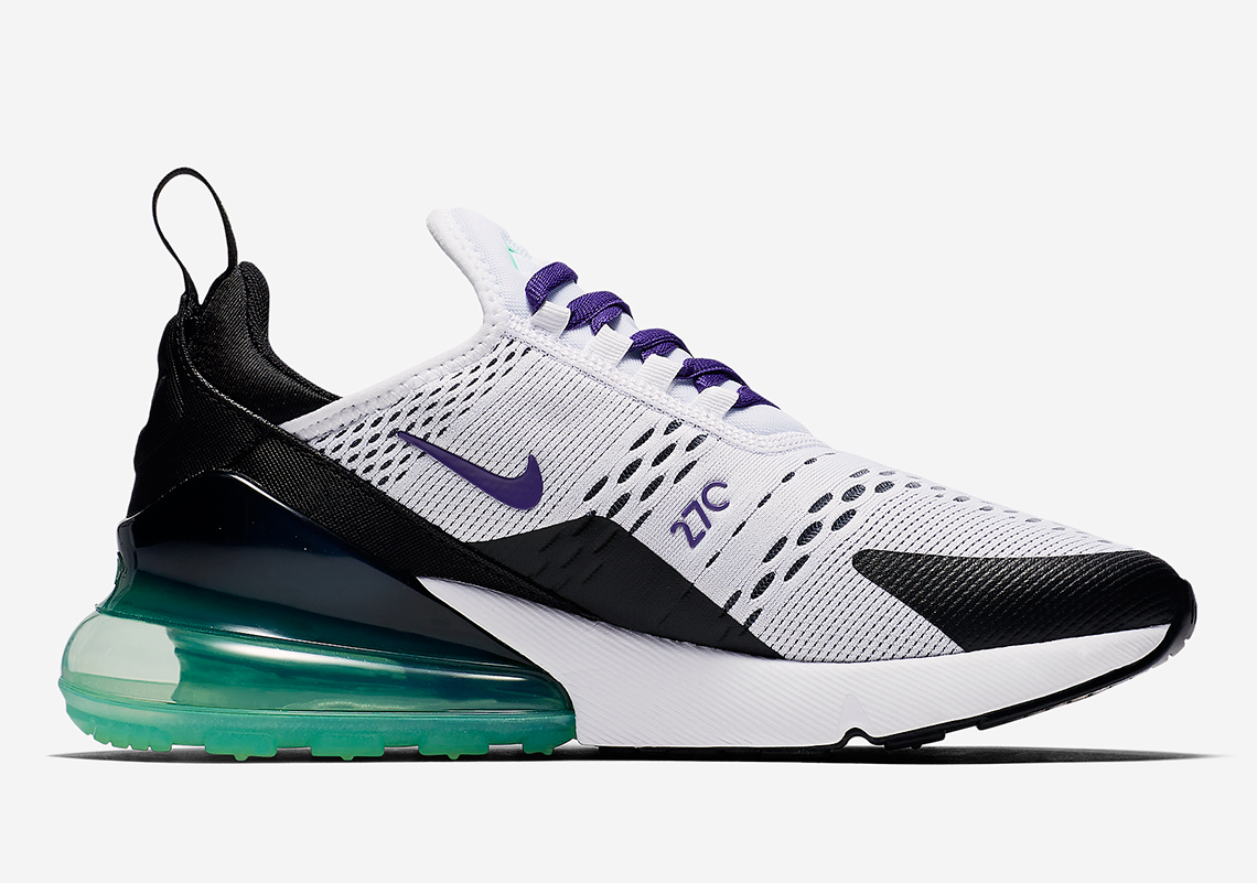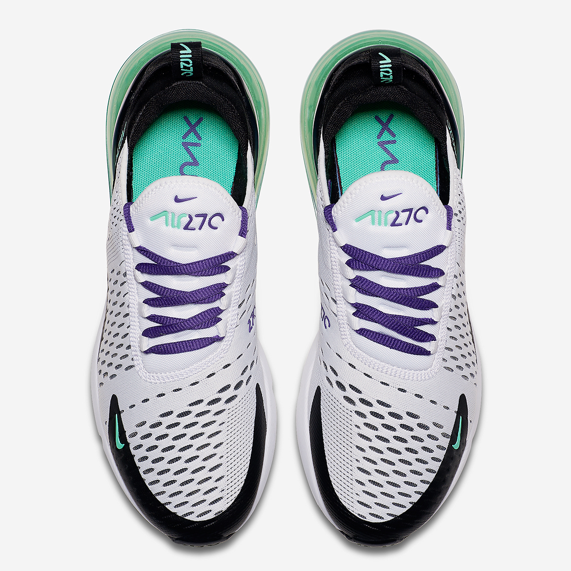 Infördes i februari 2018 får denna Nike silhuett sitt namn från den 270 graders utsikt över Air Max enheten under hälen, som förekommer här i Menta. Återanvända Air Max teknik i en livsstil gymnastiksko, denna ’Grape modell levereras också som en hyllning till Air Max 95, som lekte den färgsättning år tidigare.