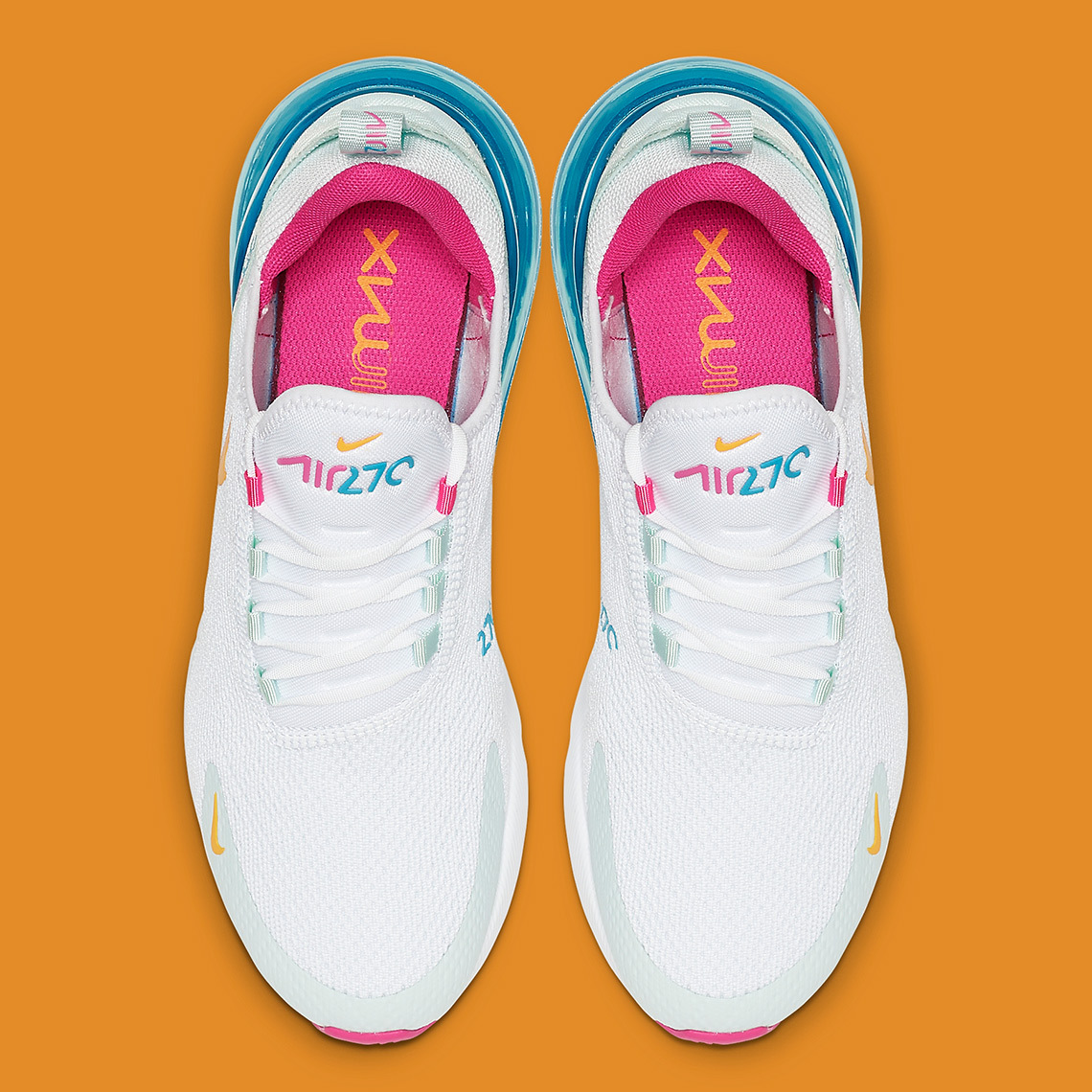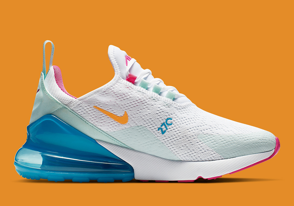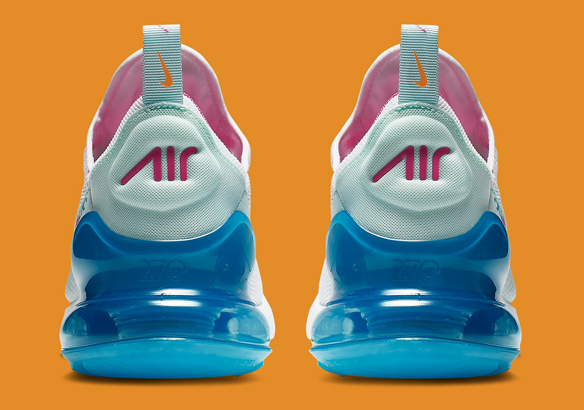 Den Wmns Air Max 270 ’Pastel’ har fått sitt namn från pastell accenter hela sin hybridkonstruktion. Skons Engineered Mesh verkar över i vitt, kompletterat med Teal Tint överlägg. University Gold framträder på Swoosh branding, med laser Fuchsia på fodret och övre öljetter. En Blue Fury Max Air enhet i hälen erbjuder den vanliga dämpning, medan yttersulan ger hela paletten tillsammans.