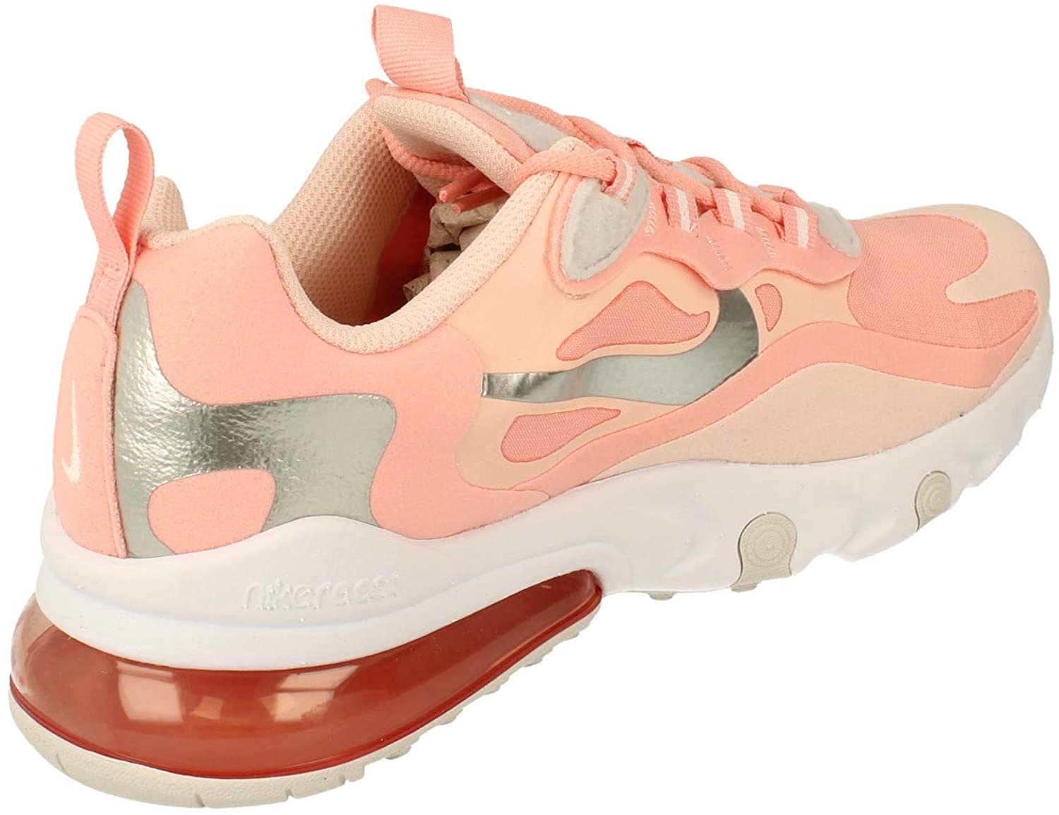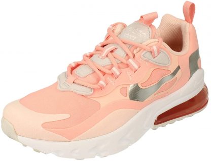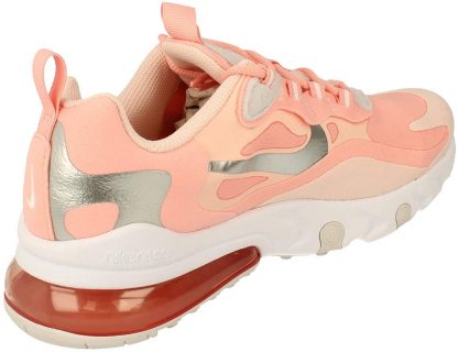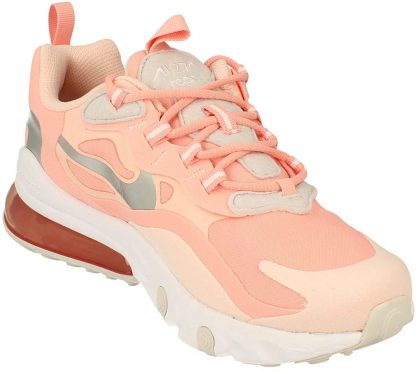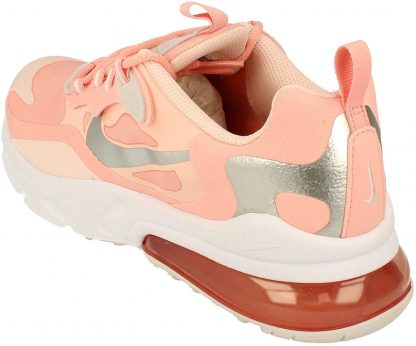 Nike Air Max 270 Reagera GG är en blandning av inspiration från Heritage kör sneakers och teknisk innovation. Uppstått i september 2019 kommer denna unge variation i en blekt Coral schema över den stickade övre vågiga ingen sy över och dragflikar. Metalliskt silver swooshes detalj sidorna. Dess vita React mellansula prunkar en ljus Max Air häl bubbla, med en gummisula sitter under den för en kontrollerad steg.