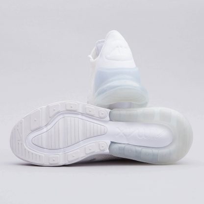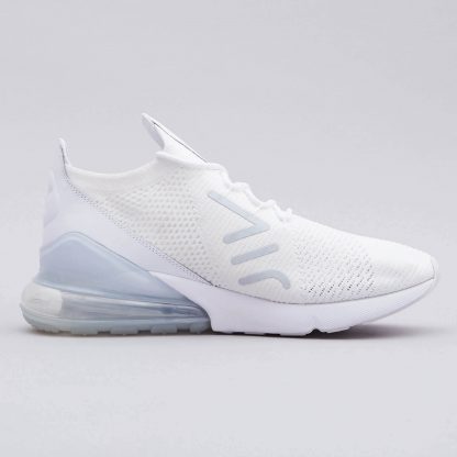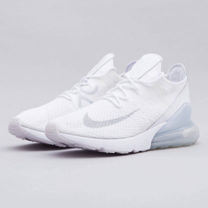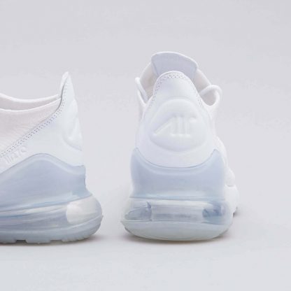 Denna Nike Air Max 270 har en all-White Flyknit övre som kommer konstruerad med en strumpa liknande krage och läder klackar. Lägga lite kontrast är ljusgrå toner på Swoosh logotyp och ”luft” branding.