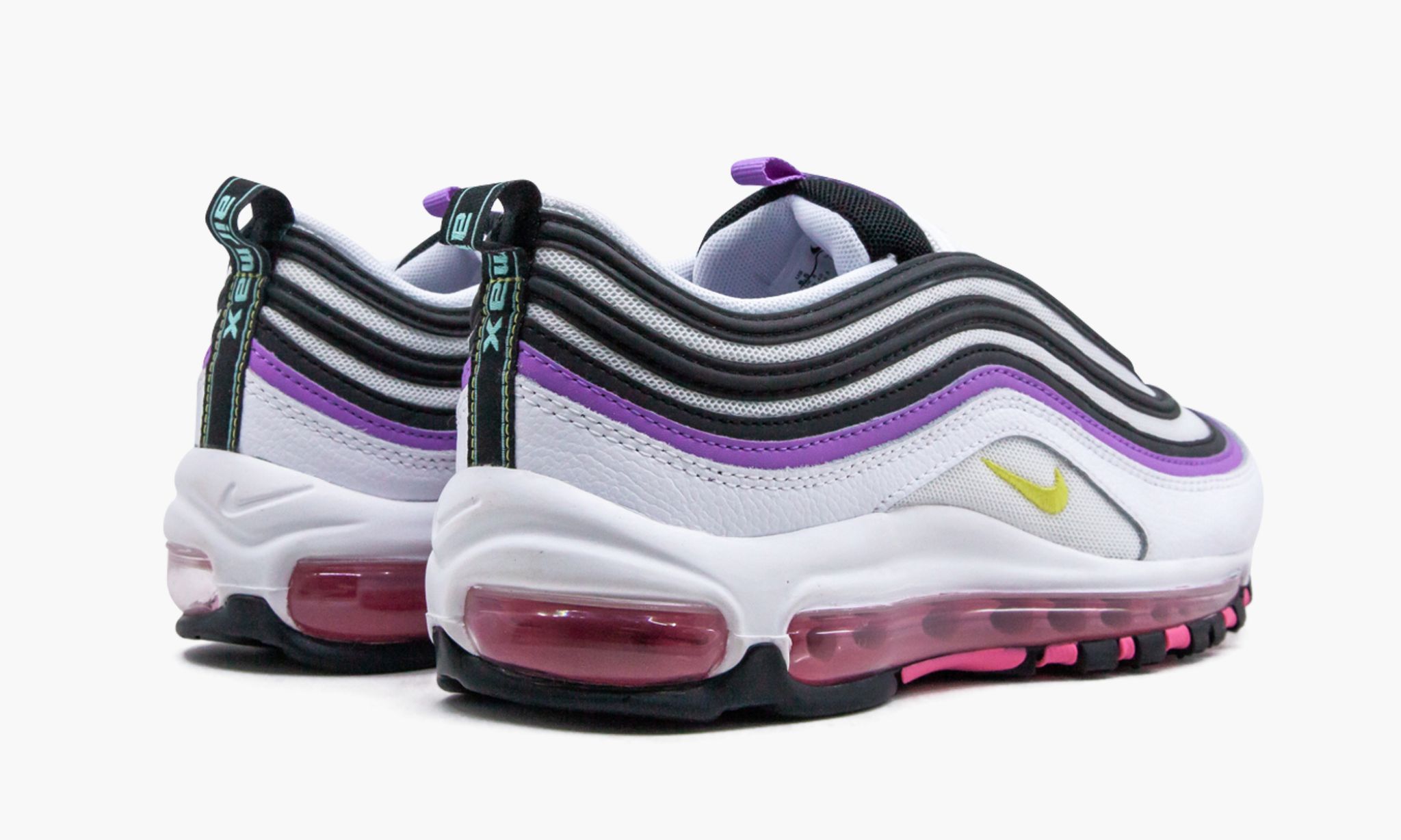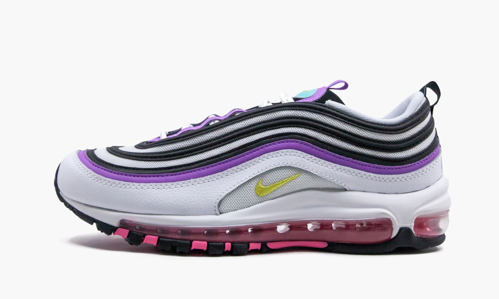 Nike Air Max 97 ”Bright Violet” hävstångs färg i detaljerna för att skapa ett unikt utseende. Vit mesh och