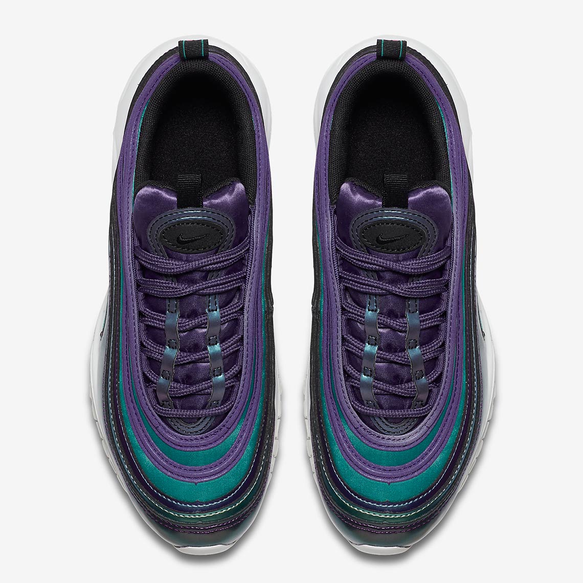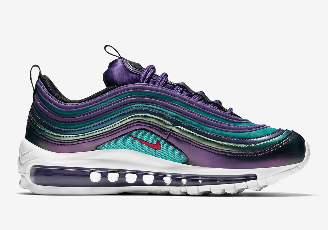 Nike Air Max 97 GS ’Skimrande’ kom ut November 2018 för klass skolbarn i en skimrande färgkombination med kricka, blått, grönt och violett. Spegling utformningen av den vuxna skor tillverkade av Christian Tresser, detta barn version har vågiga skikt som påminner om vatten ringar på en damm. Och beroende på vilken vinkel ljuset träffar ytan, färgerna förändras och arrangera i en unik visuell twist. Under hälen, mjuknar synlig Max Air dämpning varje steg.